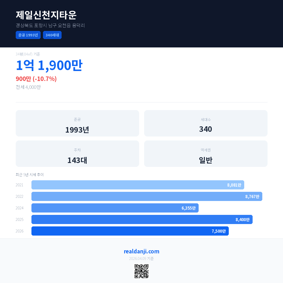 제일신천지타운 국민평형 기준 2026년 평균 거래가는 7,500만으로, 전년 대비 10.7% 하락 했습니다.