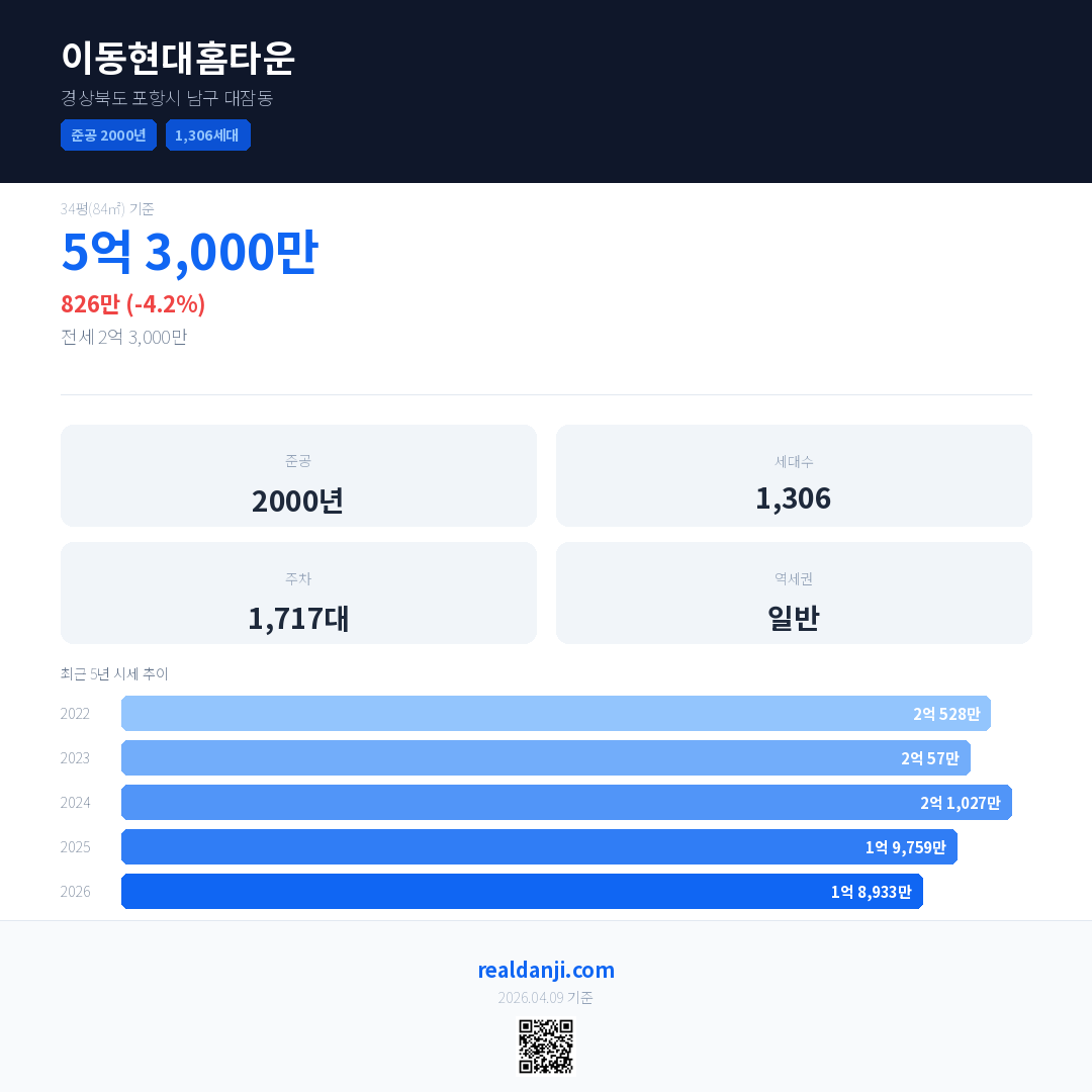 이동현대홈타운 최근 거래가는 5억 3,000만입니다. (2026-03)