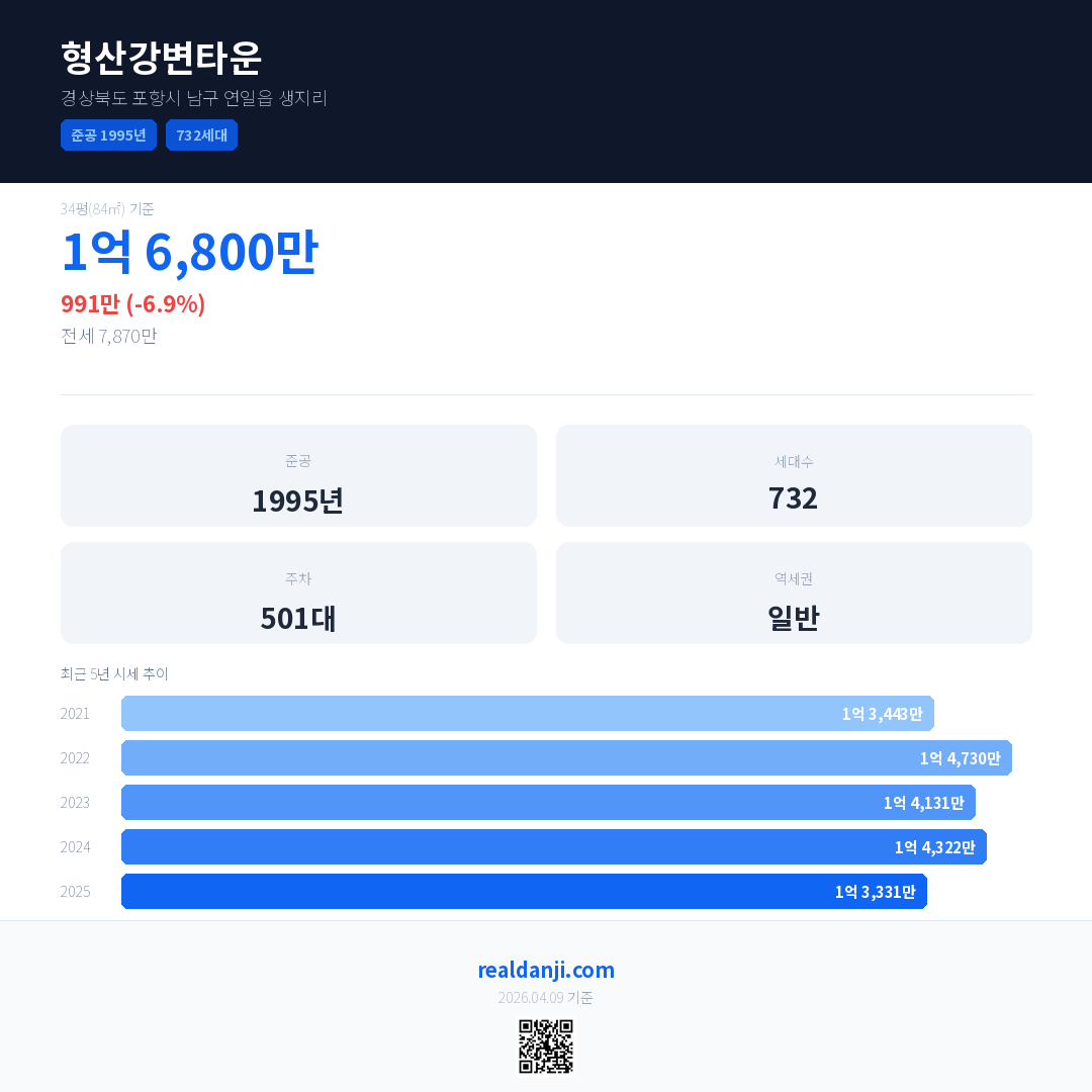 형산강변타운 최근 거래가는 5,500만입니다. (2026-04)