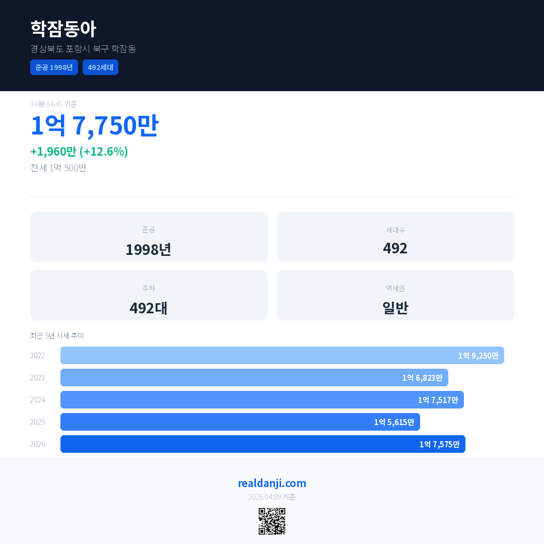 학잠동아 국민평형 기준 2026년 평균 거래가는 1억 7,575만으로, 전년 대비 12.6% 상승 했습니다.