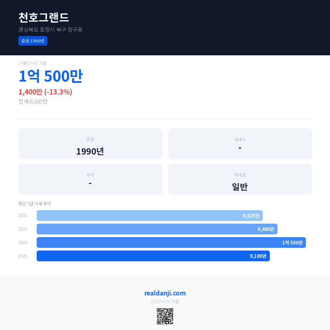 천호그랜드 국민평형 기준 2026년 평균 거래가는 9,100만으로, 전년 대비 13.3% 하락 했습니다.