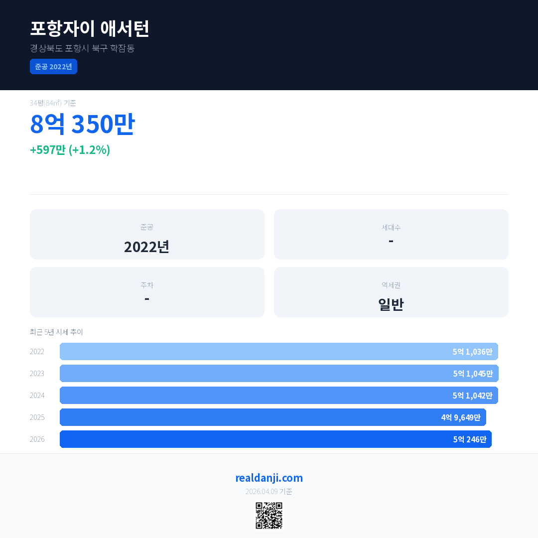 포항자이 애서턴 국민평형 기준 2026년 평균 거래가는 5억 246만으로, 전년 대비 1.2% 상승 했습니다.