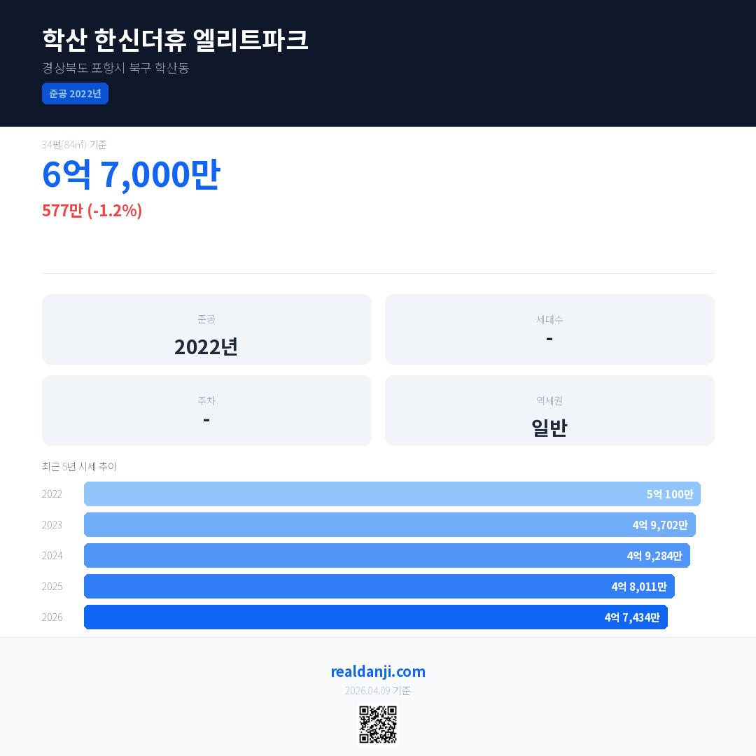 학산 한신더휴 엘리트파크 국민평형 기준 2026년 평균 거래가는 4억 7,434만으로, 전년 대비 1.2% 하락 했습니다.