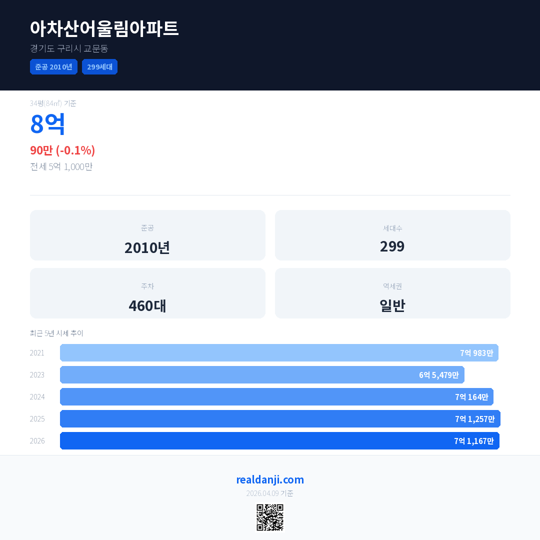 아차산어울림아파트 최근 거래가는 8억입니다. (2026-02)