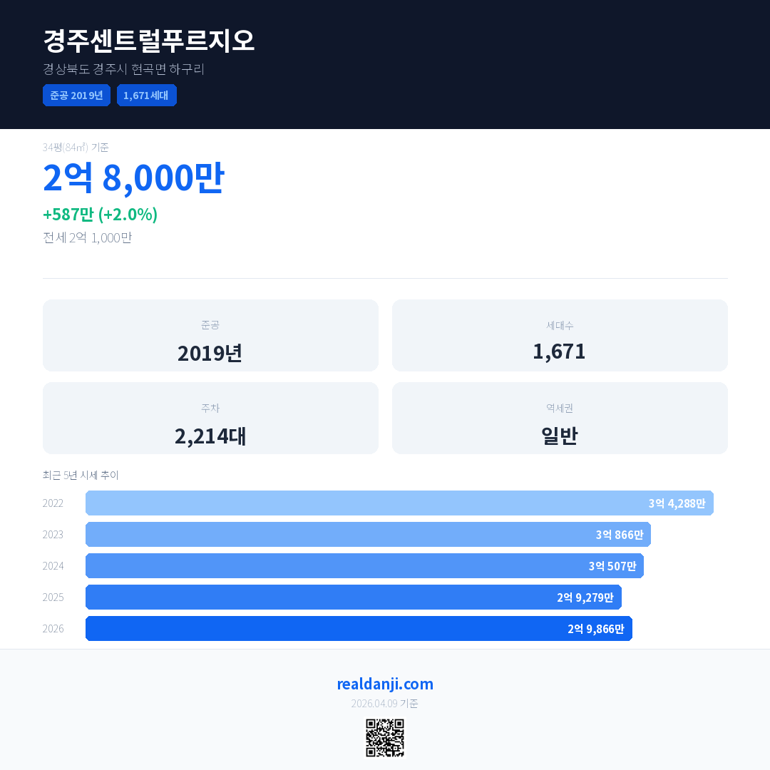 경주센트럴푸르지오 국민평형 기준 2026년 평균 거래가는 2억 9,866만으로, 전년 대비 2.0% 상승 했습니다.