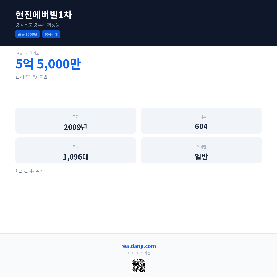 현진에버빌1차은(는) 2009년에 준공되었으며, 현재 17년차입니다. 총 604세대 규모입니다.