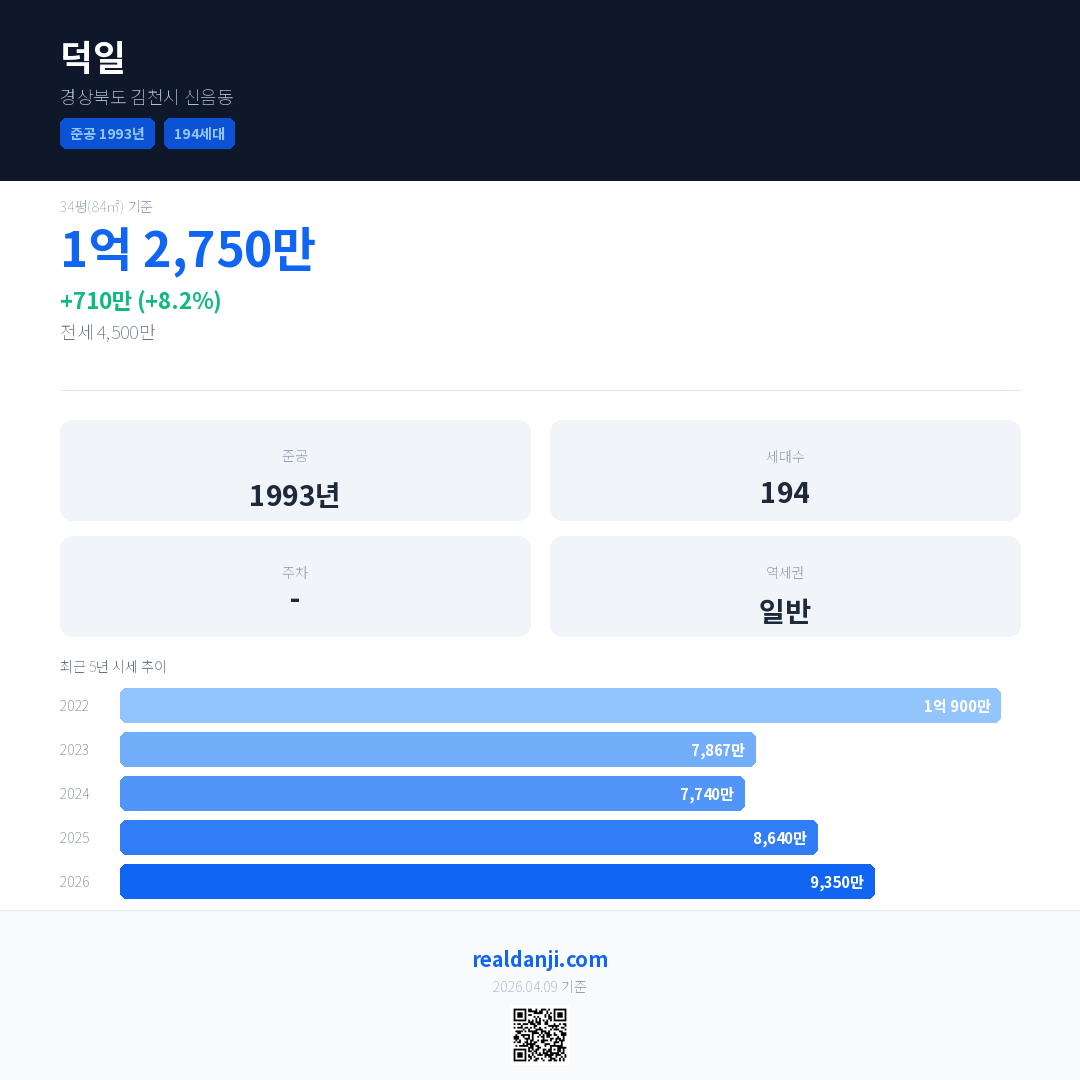 덕일 국민평형 기준 2026년 평균 거래가는 9,350만으로, 전년 대비 8.2% 상승 했습니다.