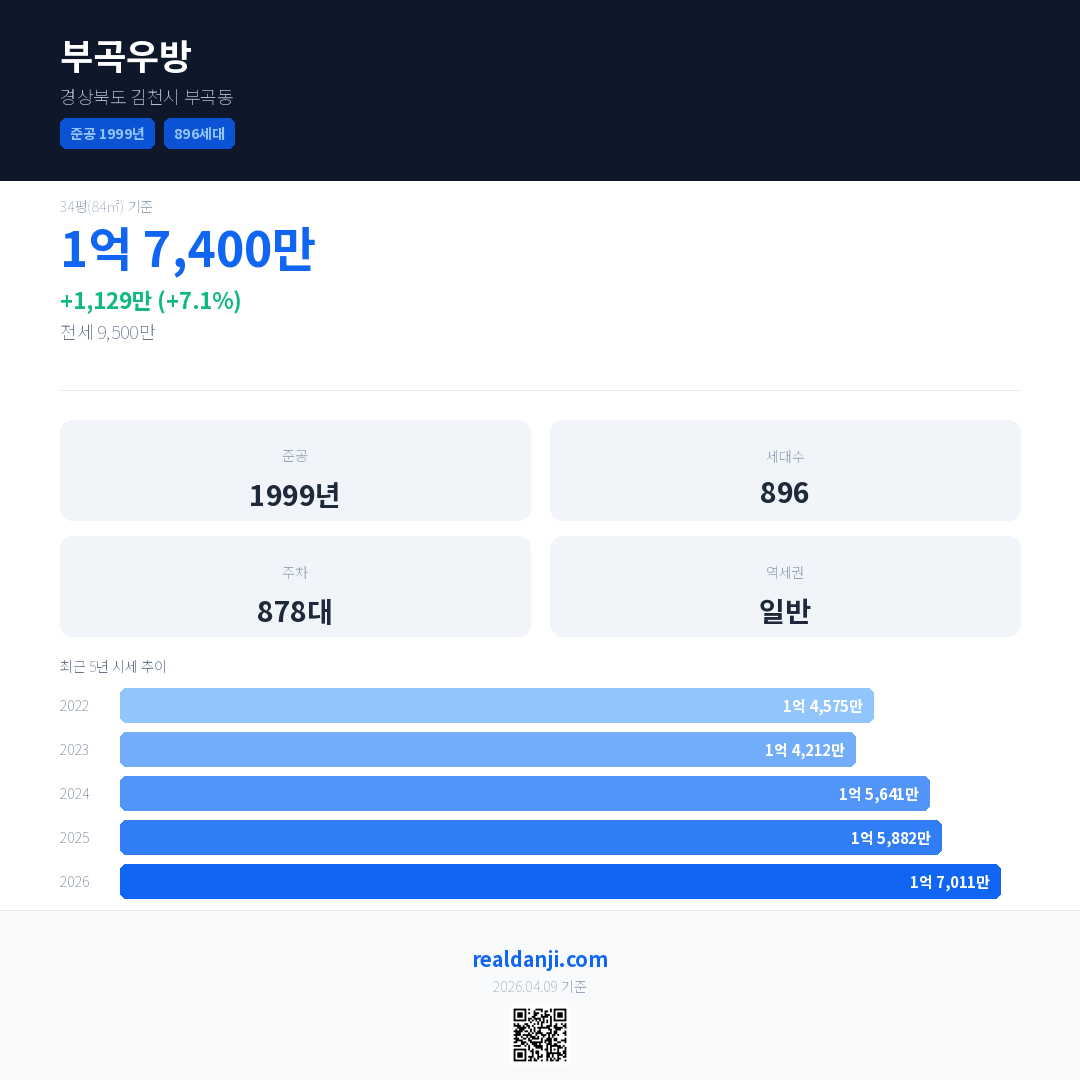 부곡우방 국민평형 기준 2026년 평균 거래가는 1억 7,011만으로, 전년 대비 7.1% 상승 했습니다.