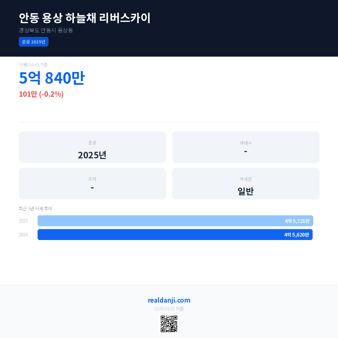 안동 용상 하늘채 리버스카이 국민평형 기준 2026년 평균 거래가는 4억 5,620만으로, 전년 대비 0.2% 하락 했습니다.