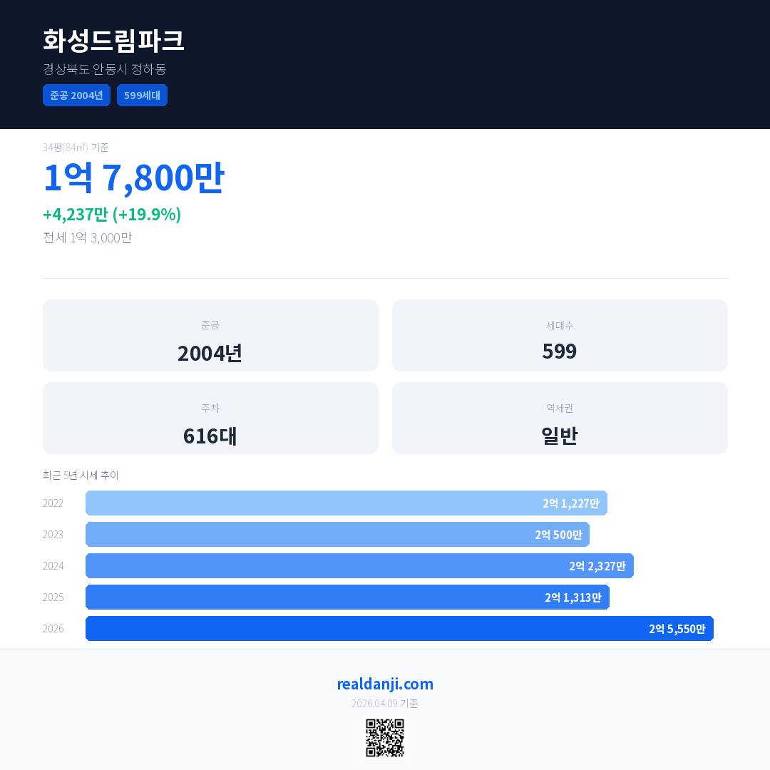 화성드림파크 국민평형 기준 2026년 평균 거래가는 2억 5,550만으로, 전년 대비 19.9% 상승 했습니다.