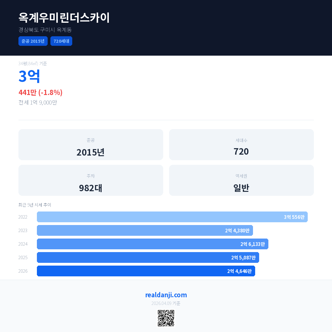 옥계우미린더스카이 국민평형 기준 2026년 평균 거래가는 2억 4,646만으로, 전년 대비 1.8% 하락 했습니다.