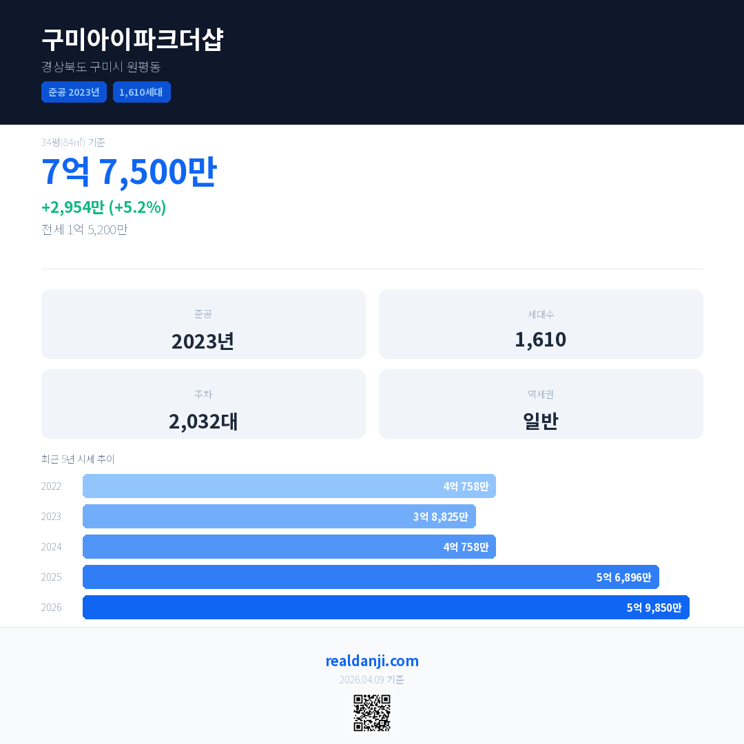 구미아이파크더샵 국민평형 기준 2026년 평균 거래가는 5억 9,850만으로, 전년 대비 5.2% 상승 했습니다.