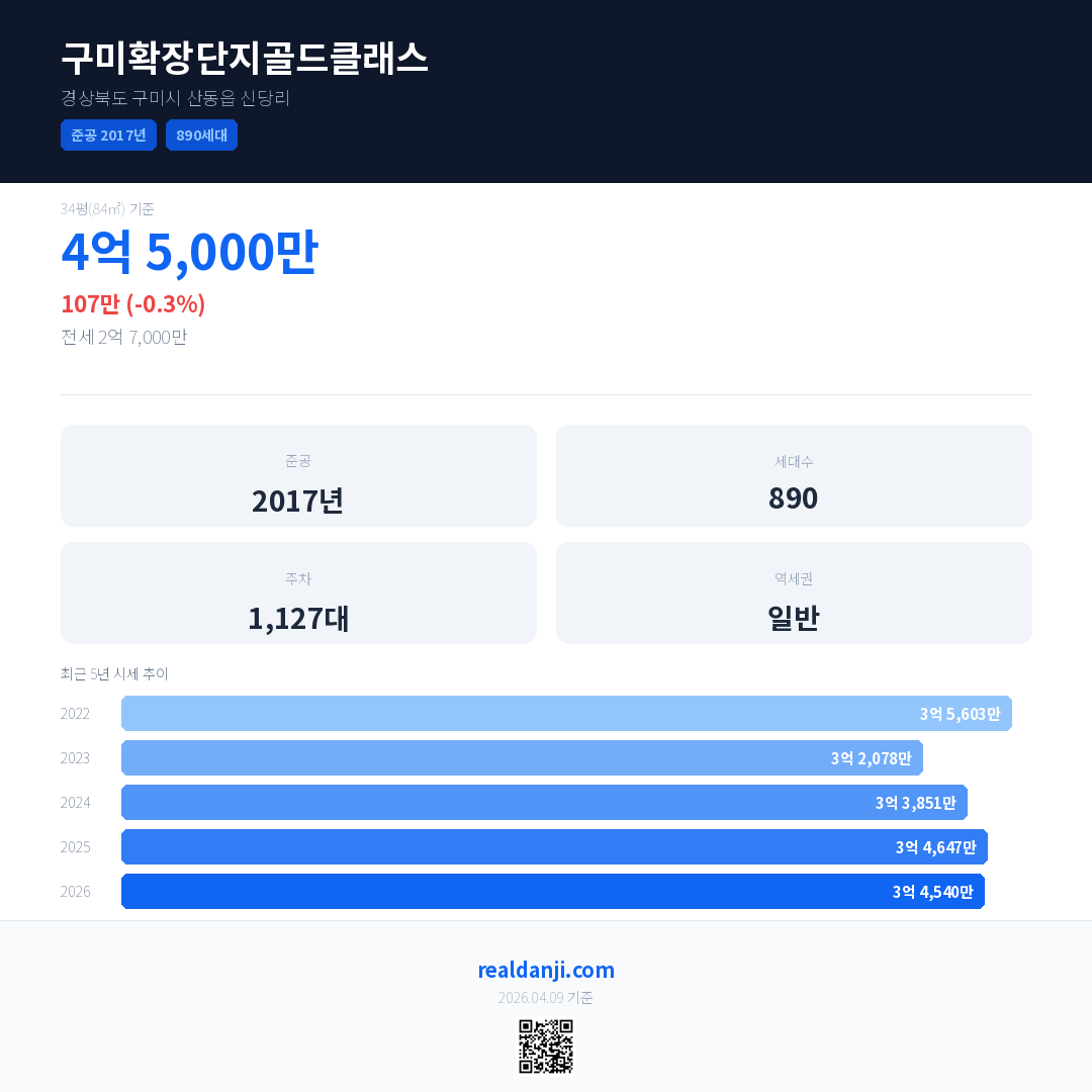 구미확장단지골드클래스 최근 거래가는 4억 5,000만입니다. (2026-04)