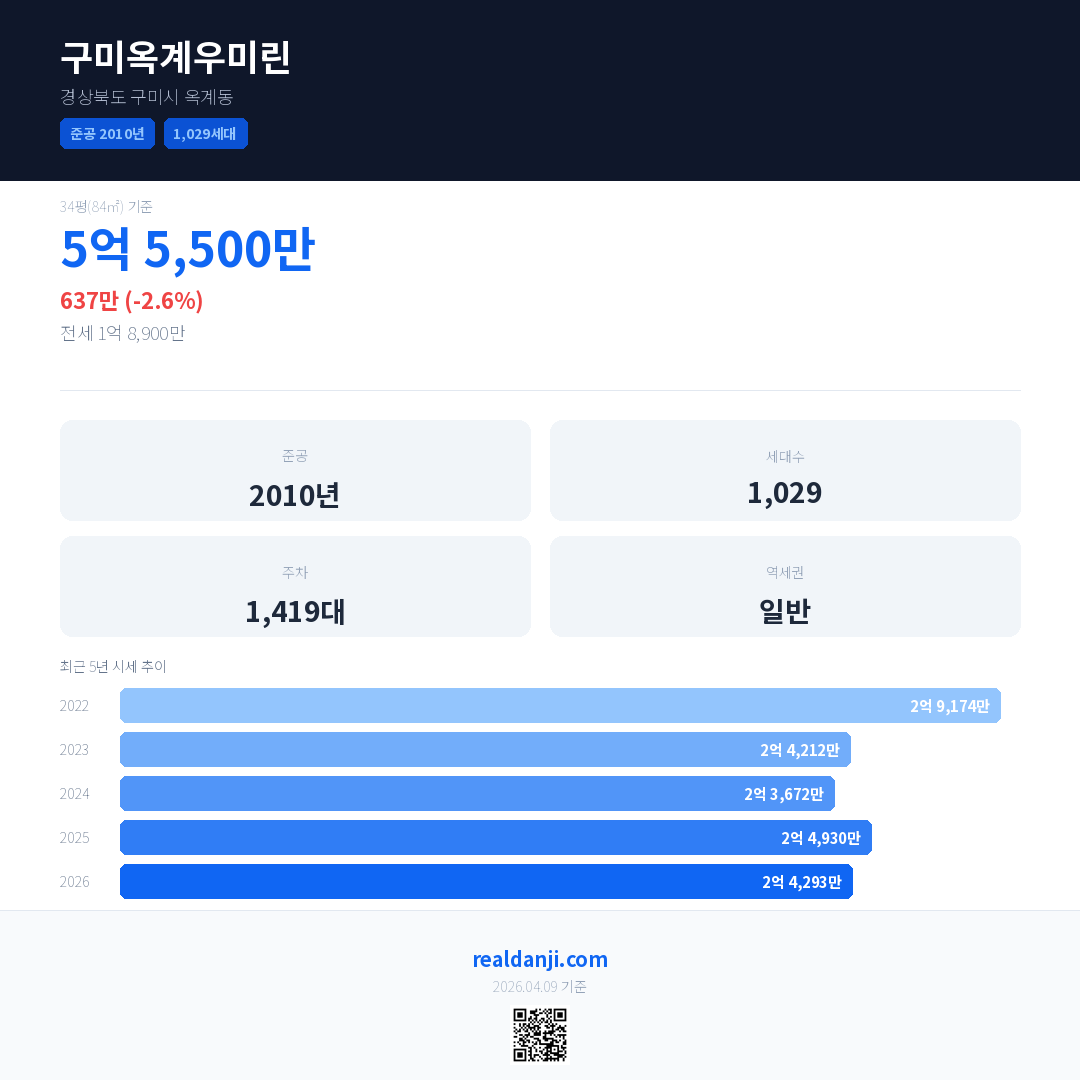 구미옥계우미린 최근 거래가는 5억 5,500만입니다. (2026-03)