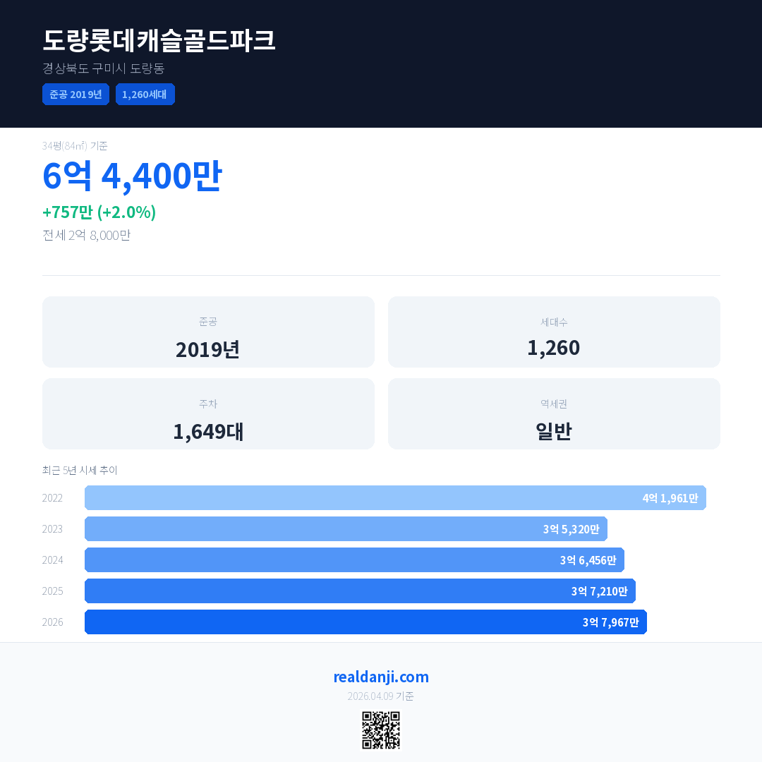 도량롯데캐슬골드파크은(는) 2019년에 준공되었으며, 현재 7년차입니다. 총 1,260세대 규모입니다.