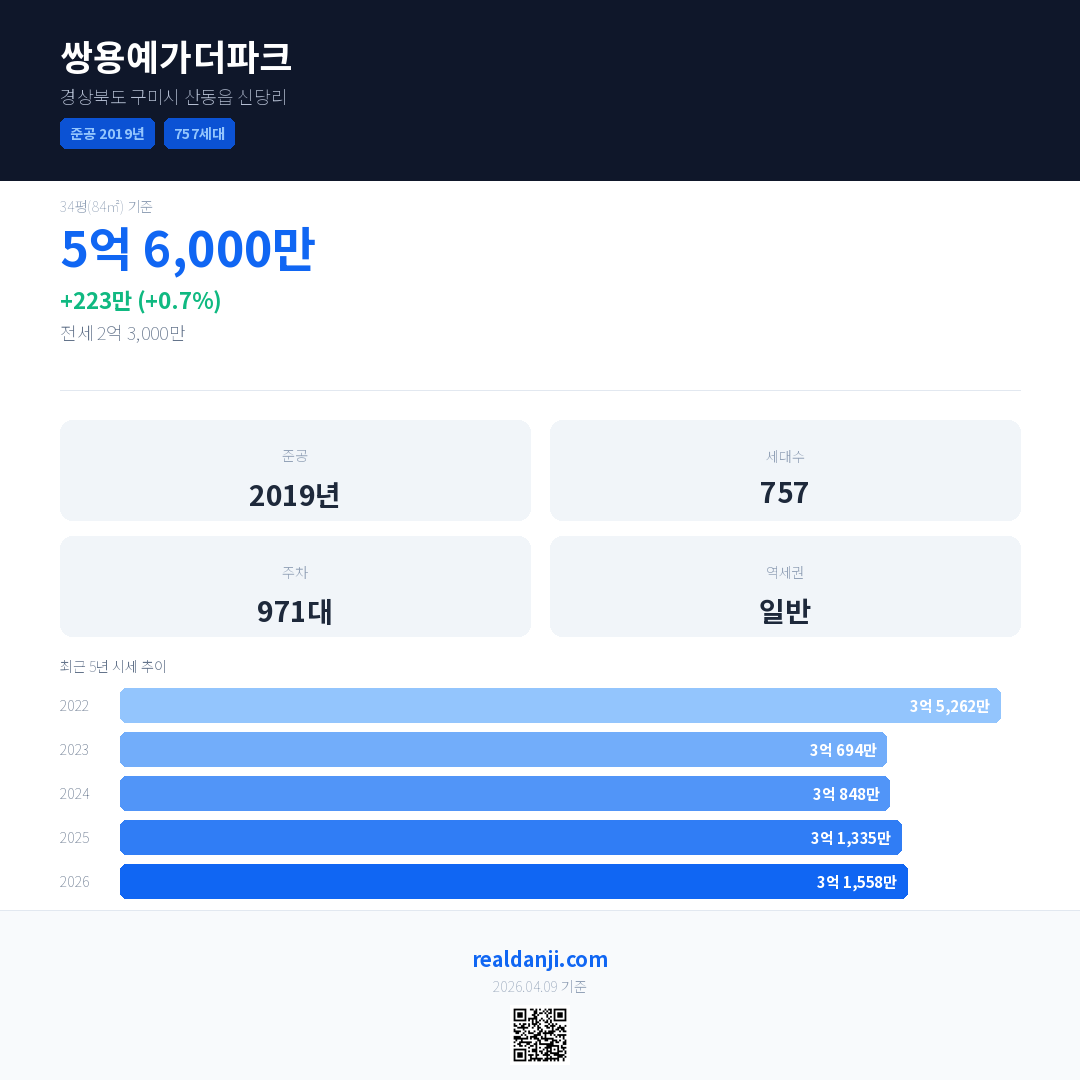 쌍용예가더파크 국민평형 기준 2026년 평균 거래가는 3억 1,558만으로, 전년 대비 0.7% 상승 했습니다.