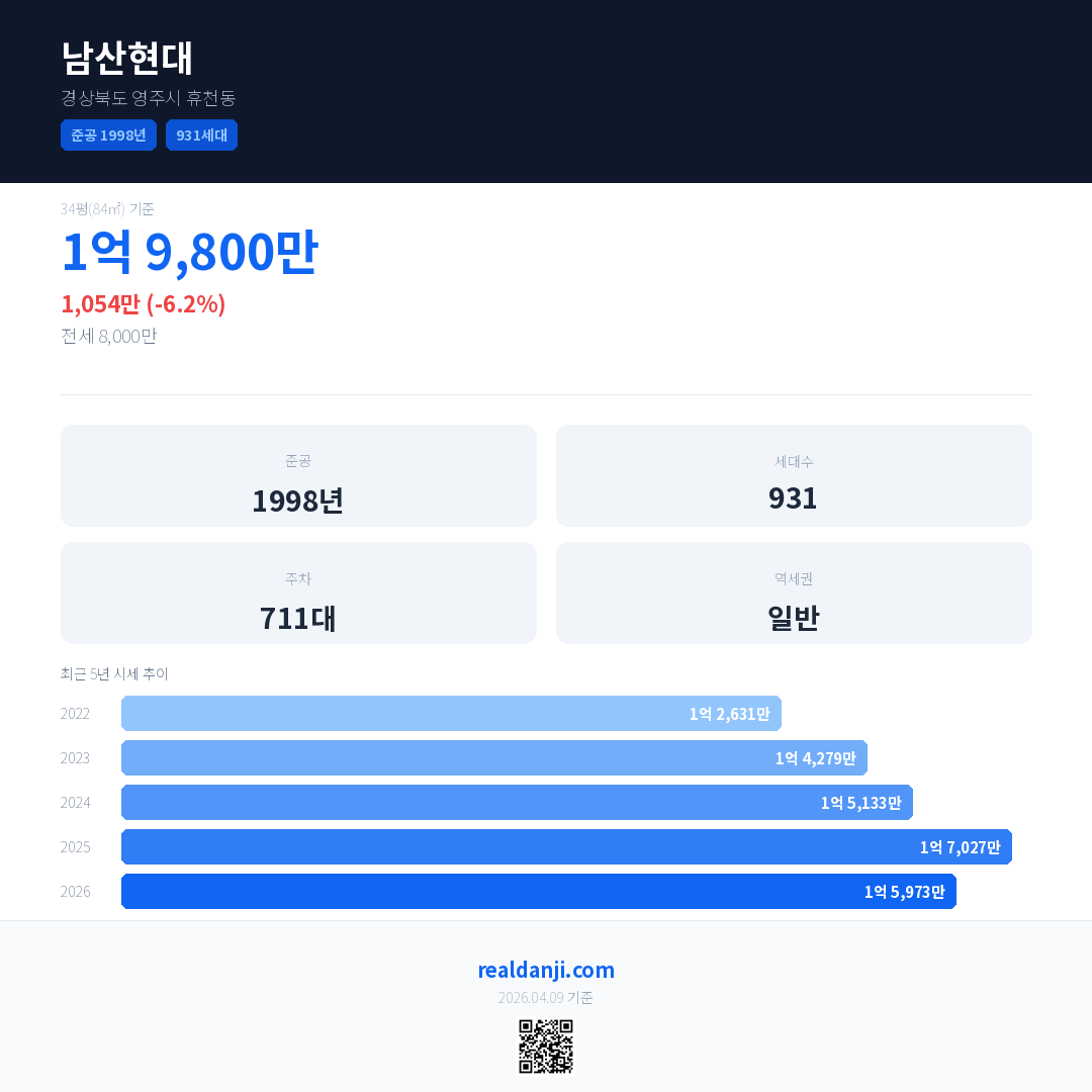 남산현대 국민평형 기준 2026년 평균 거래가는 1억 5,973만으로, 전년 대비 6.2% 하락 했습니다.