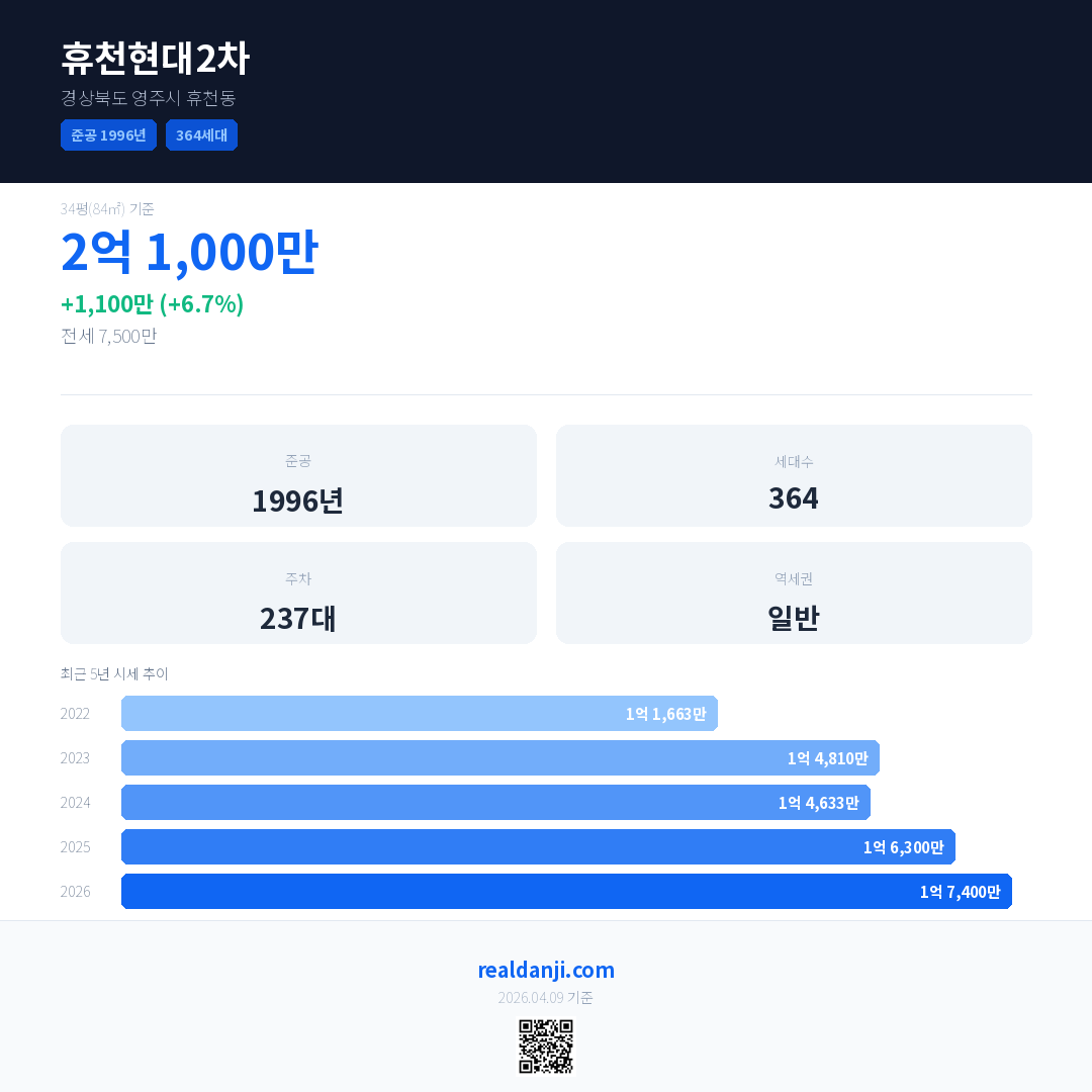 휴천현대2차 국민평형 기준 2026년 평균 거래가는 1억 7,400만으로, 전년 대비 6.7% 상승 했습니다.