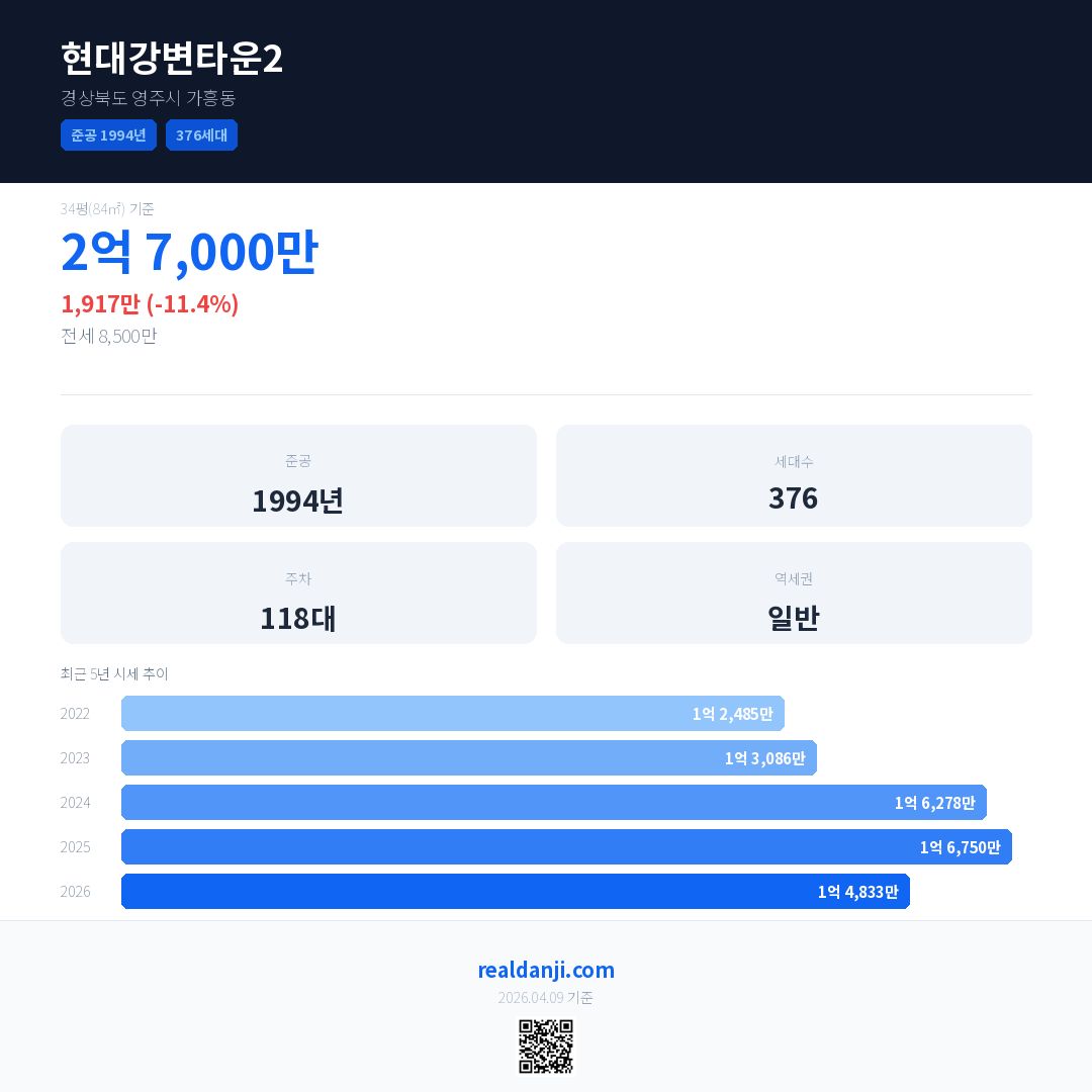 현대강변타운2 최근 거래가는 2억 7,000만입니다. (2026-03)