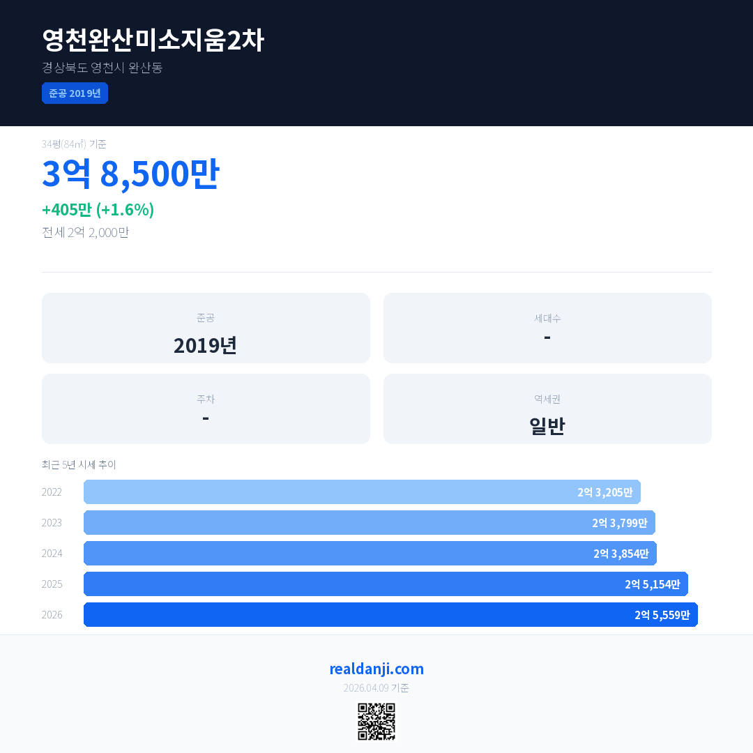 영천완산미소지움2차 국민평형 기준 2026년 평균 거래가는 2억 5,559만으로, 전년 대비 1.6% 상승 했습니다.