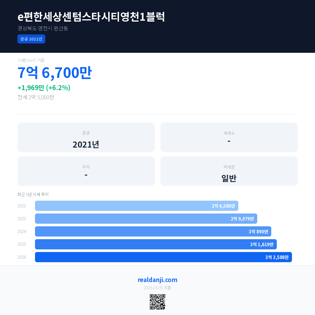 e편한세상센텀스타시티영천1블럭 국민평형 기준 2026년 평균 거래가는 3억 3,588만으로, 전년 대비 6.2% 상승 했습니다.