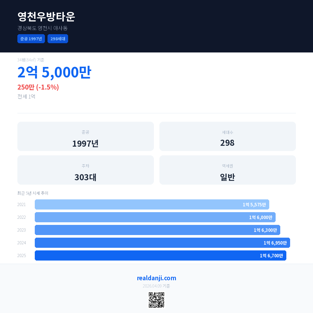 영천우방타운 최근 거래가는 2억 5,000만입니다. (2026-03)
