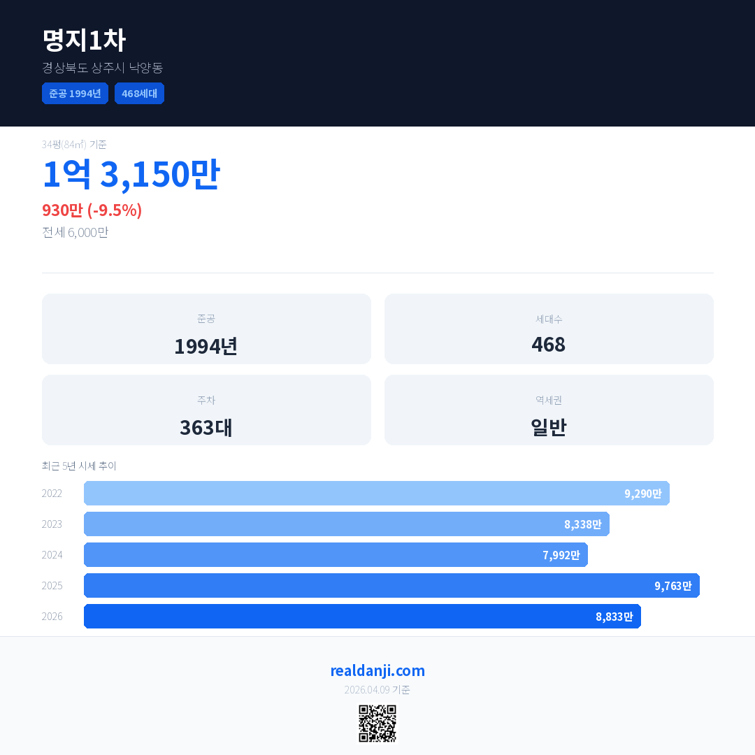 명지1차 국민평형 기준 2026년 평균 거래가는 8,833만으로, 전년 대비 9.5% 하락 했습니다.