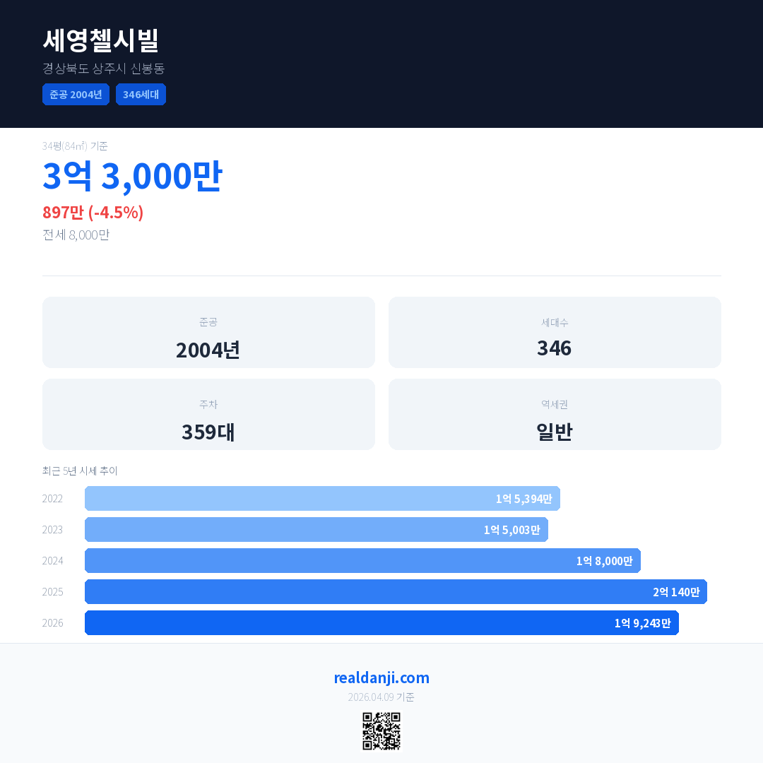 세영첼시빌 국민평형 기준 2026년 평균 거래가는 1억 9,243만으로, 전년 대비 4.5% 하락 했습니다.