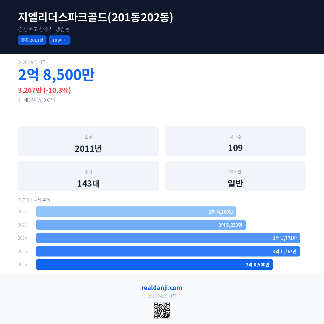 지엘리더스파크골드(201동202동) 국민평형 기준 2026년 평균 거래가는 2억 8,500만으로, 전년 대비 10.3% 하락 했습니다.