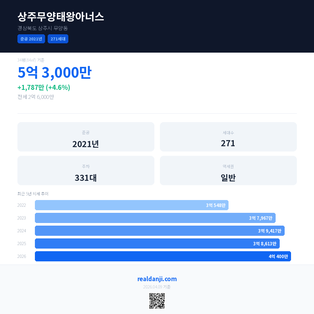상주무양태왕아너스 국민평형 기준 2026년 평균 거래가는 4억 400만으로, 전년 대비 4.6% 상승 했습니다.