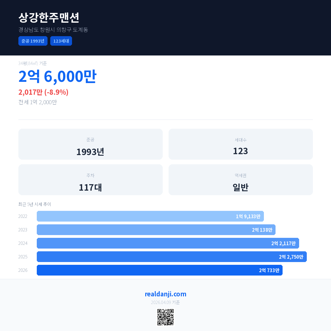 상강한주맨션 국민평형 기준 2026년 평균 거래가는 2억 733만으로, 전년 대비 8.9% 하락 했습니다.