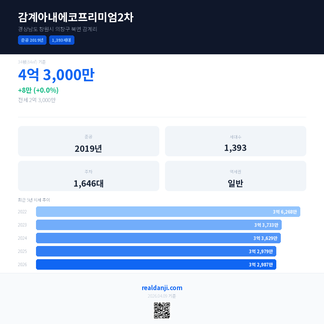 감계아내에코프리미엄2차 국민평형 기준 2026년 평균 거래가는 3억 2,987만으로, 전년 대비 0.0% 하락 했습니다.