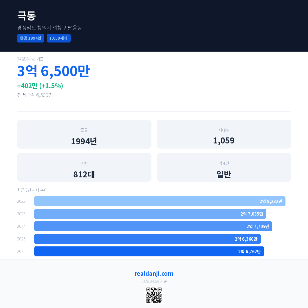 극동 국민평형 기준 2026년 평균 거래가는 2억 6,762만으로, 전년 대비 1.5% 상승 했습니다.