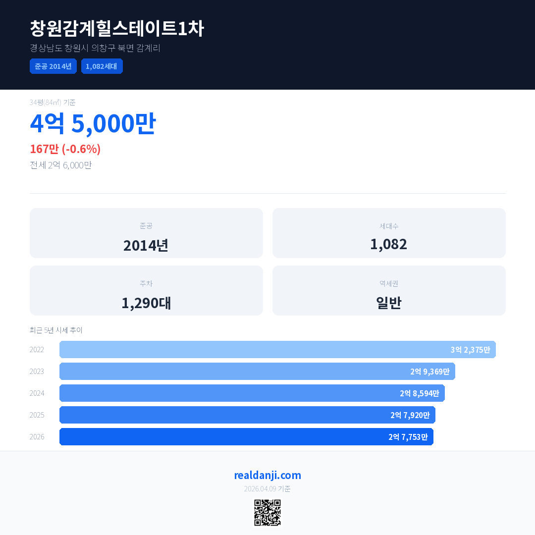 창원감계힐스테이트1차 최근 거래가는 4억 5,000만입니다. (2026-03)