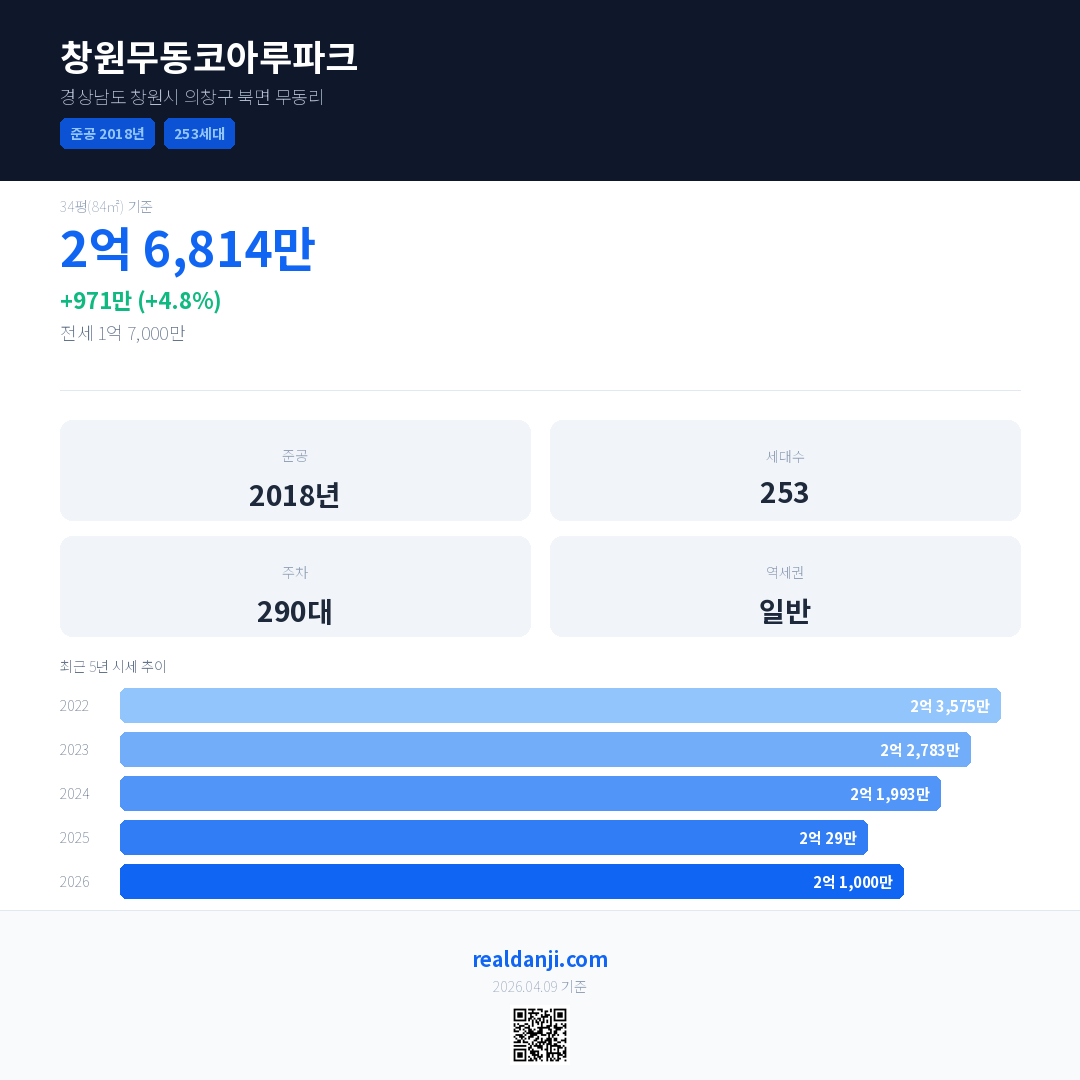창원무동코아루파크 국민평형 기준 2026년 평균 거래가는 2억 1,000만으로, 전년 대비 4.8% 상승 했습니다.