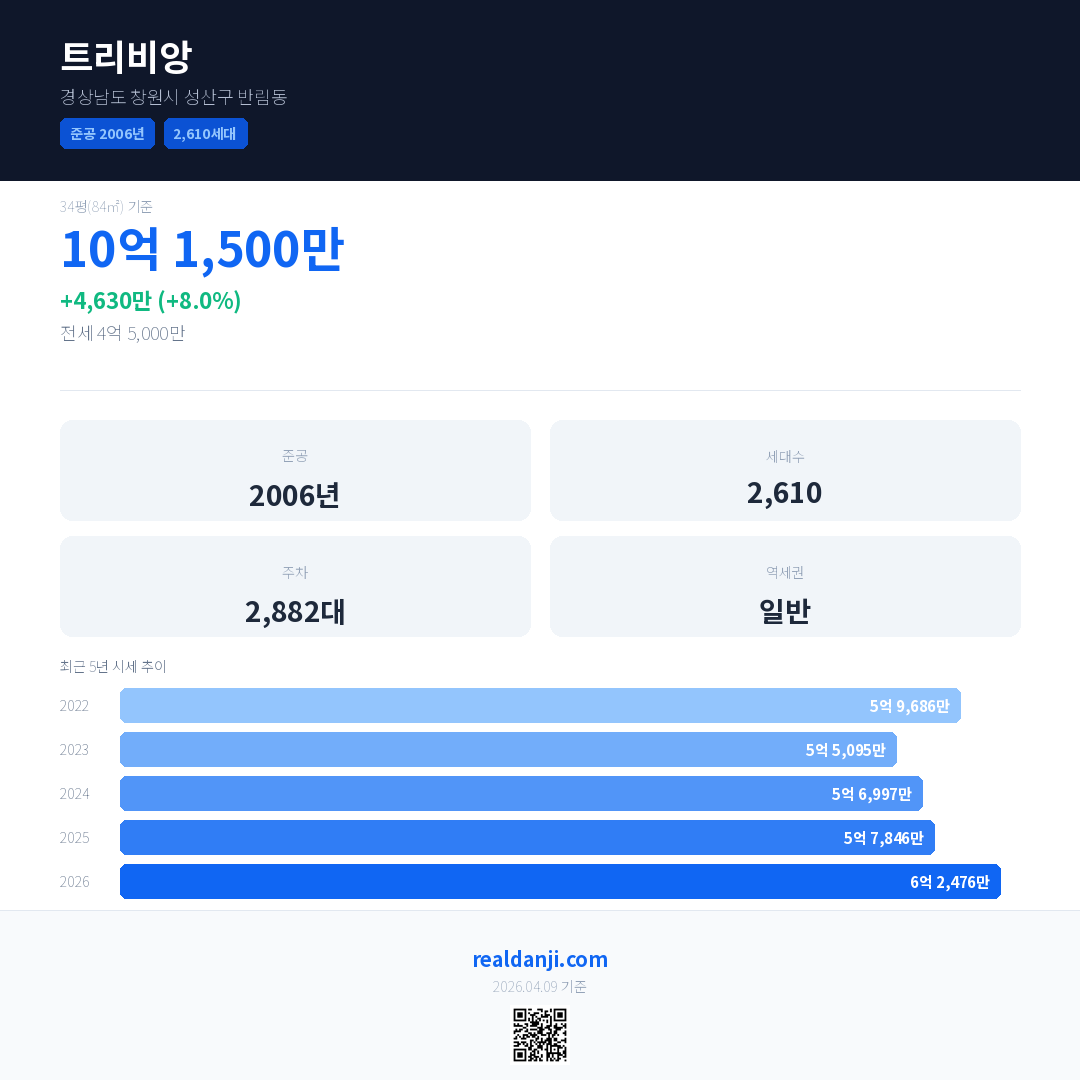 트리비앙 국민평형 기준 2026년 평균 거래가는 6억 2,538만으로, 전년 대비 8.1% 상승 했습니다.