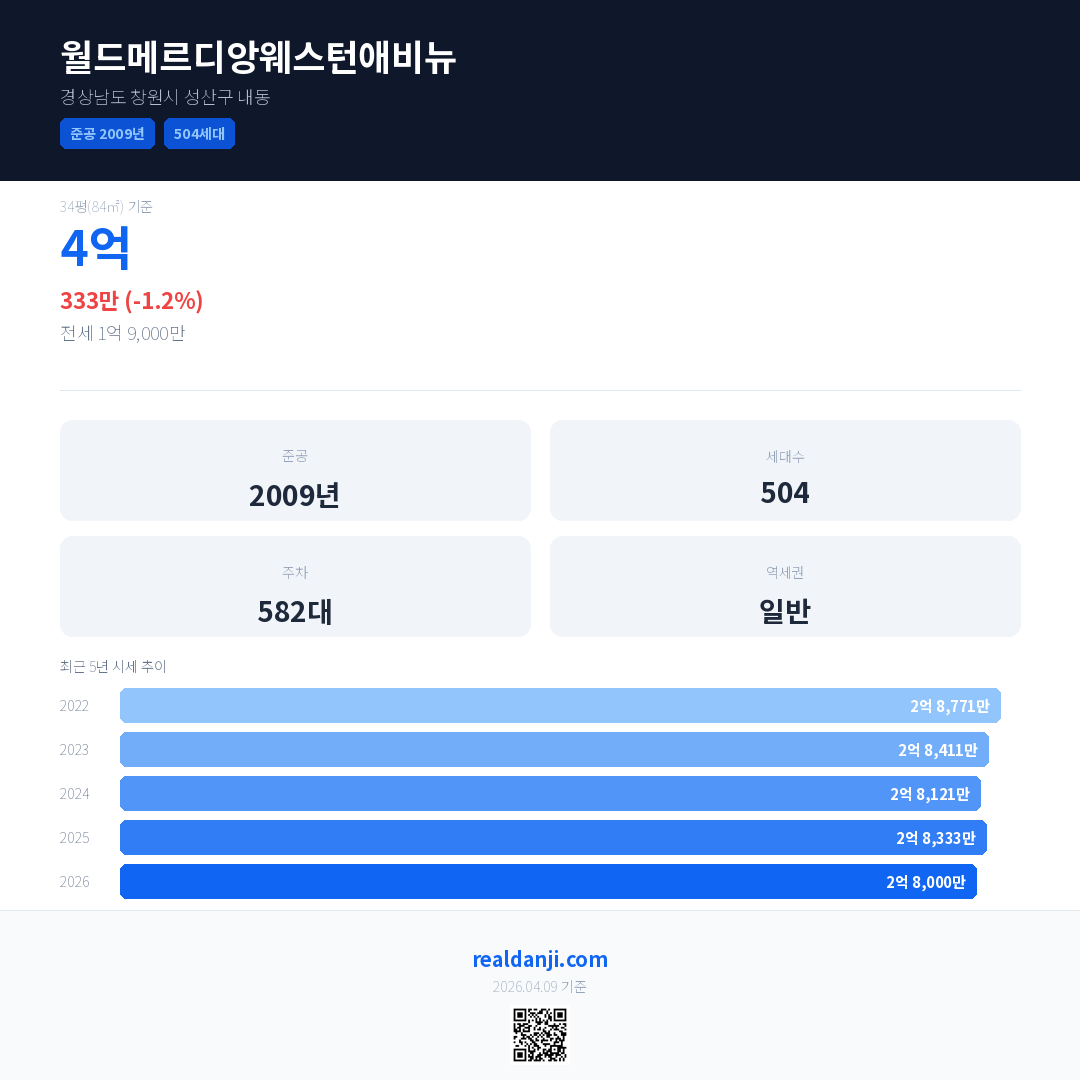 월드메르디앙웨스턴애비뉴 최근 거래가는 4억입니다. (2026-03)