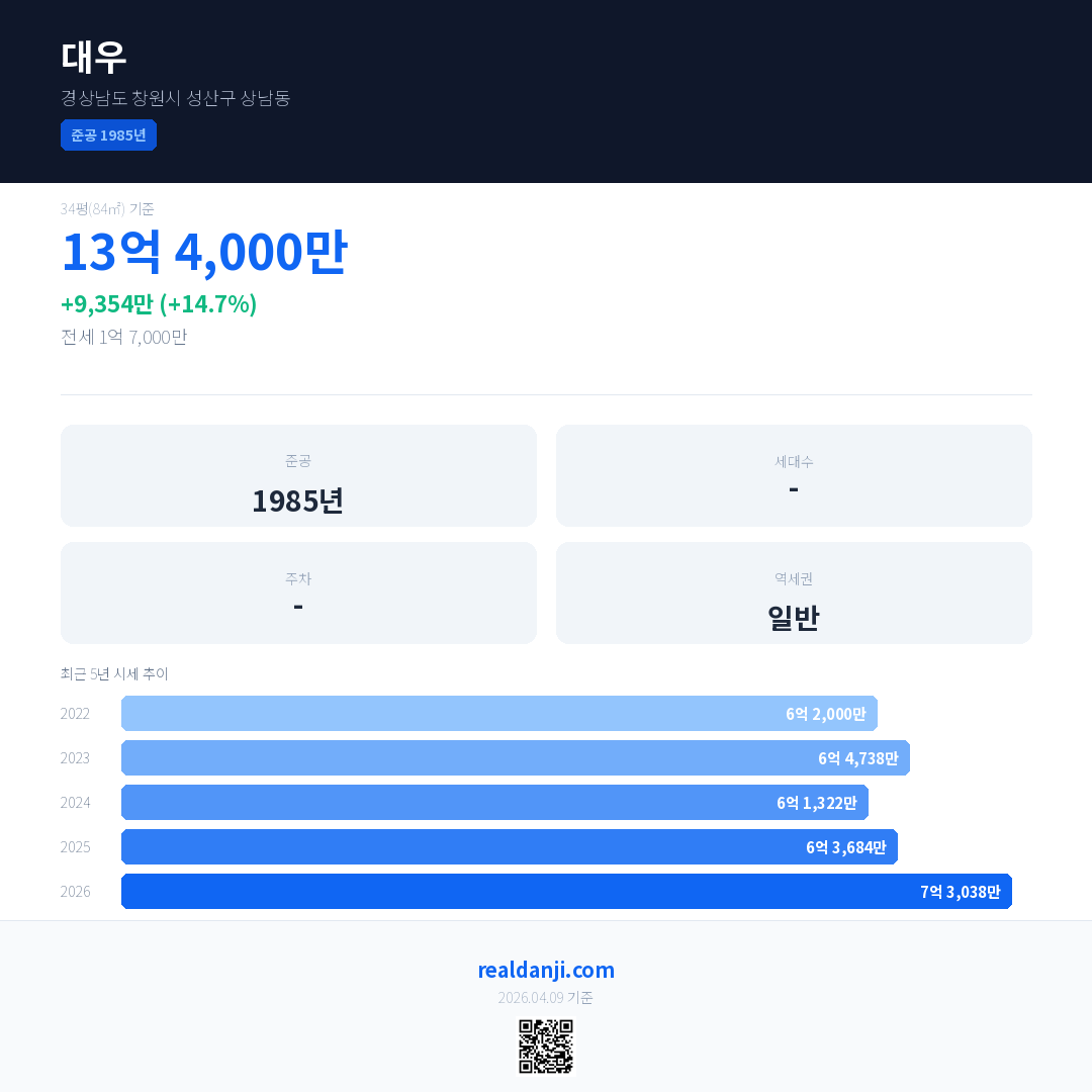 대우 국민평형 기준 2026년 평균 거래가는 7억 3,038만으로, 전년 대비 14.7% 상승 했습니다.