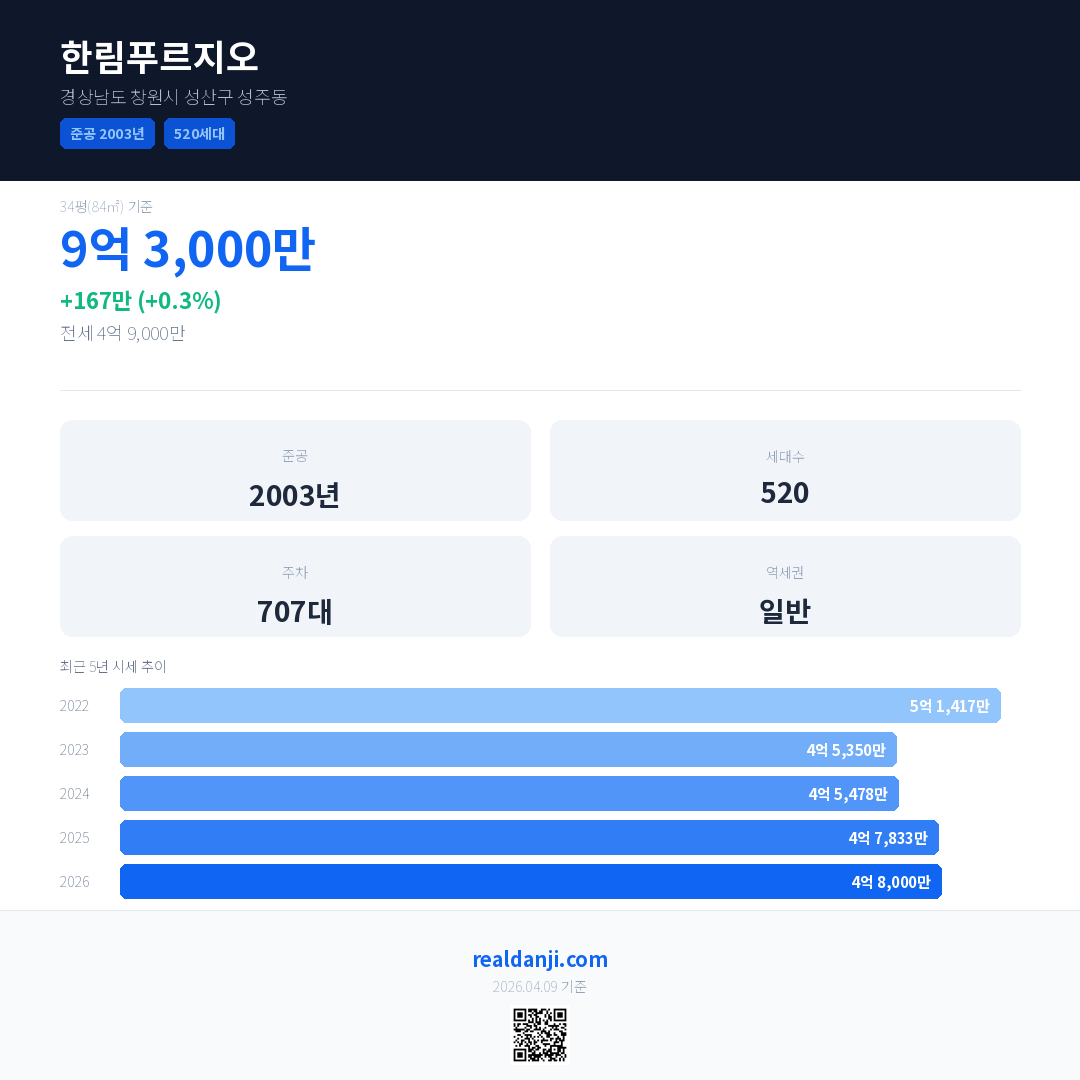 한림푸르지오 국민평형 기준 2026년 평균 거래가는 4억 8,000만으로, 전년 대비 0.3% 상승 했습니다.