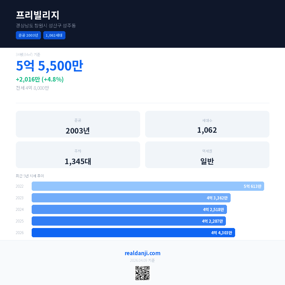 프리빌리지 국민평형 기준 2026년 평균 거래가는 4억 4,303만으로, 전년 대비 4.8% 상승 했습니다.