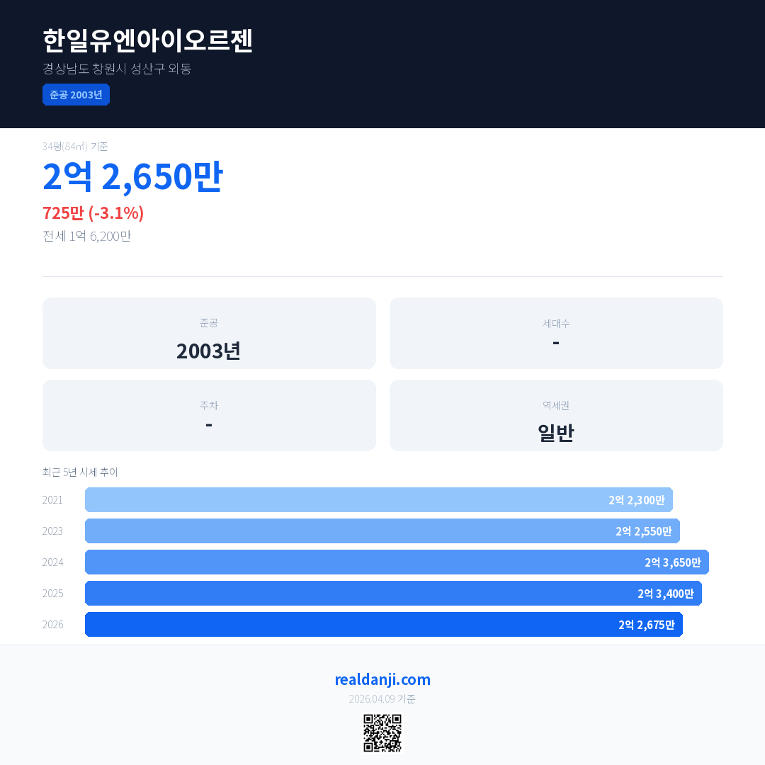 한일유엔아이오르젠 국민평형 기준 2026년 평균 거래가는 2억 2,675만으로, 전년 대비 3.1% 하락 했습니다.