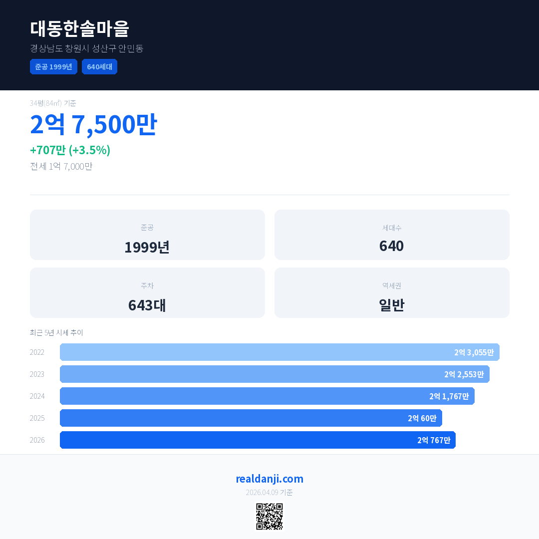 대동한솔마을 국민평형 기준 2026년 평균 거래가는 2억 767만으로, 전년 대비 3.5% 상승 했습니다.