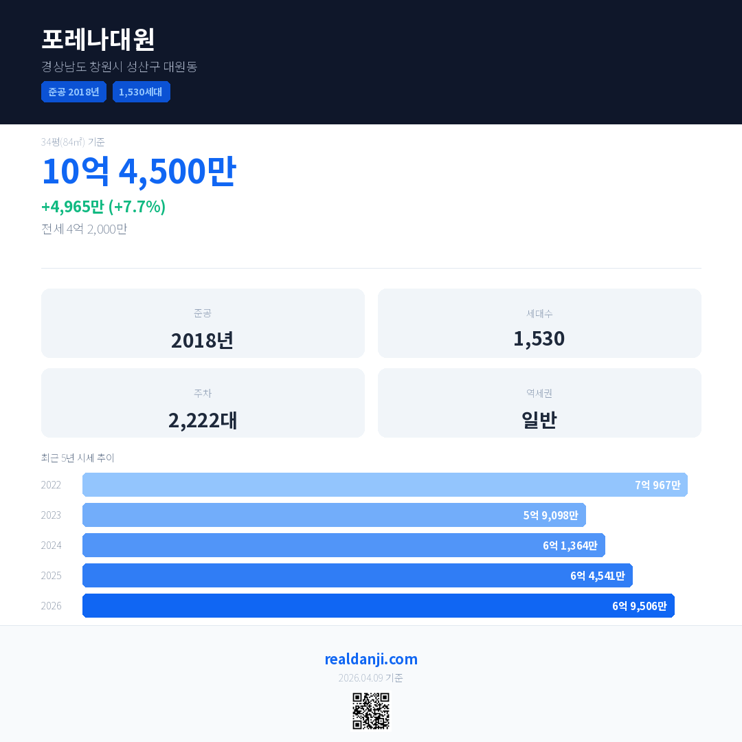 포레나대원 국민평형 기준 2026년 평균 거래가는 6억 9,506만으로, 전년 대비 7.7% 상승 했습니다.