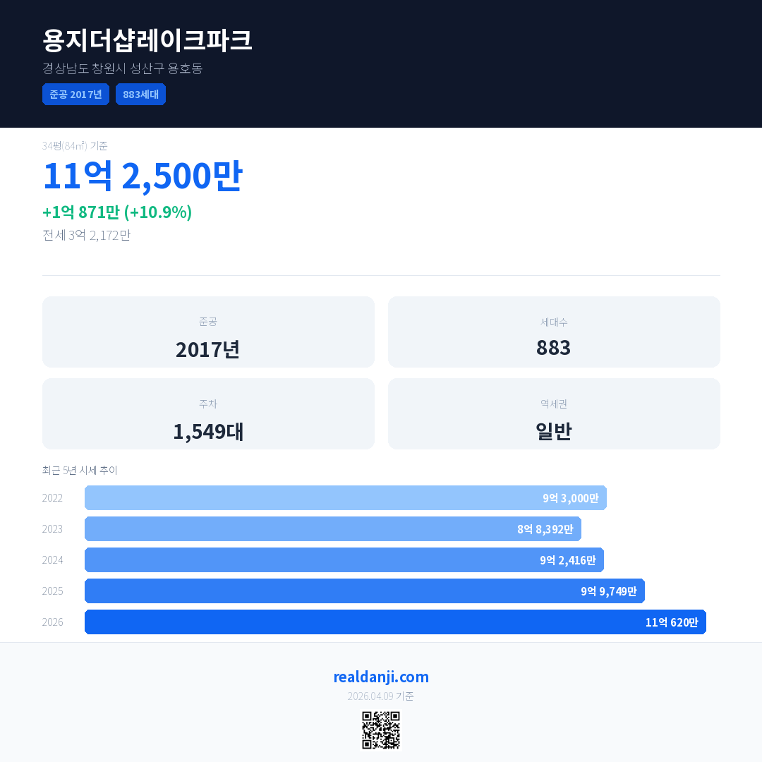 용지더샵레이크파크 국민평형 기준 2026년 평균 거래가는 11억 620만으로, 전년 대비 10.9% 상승 했습니다.