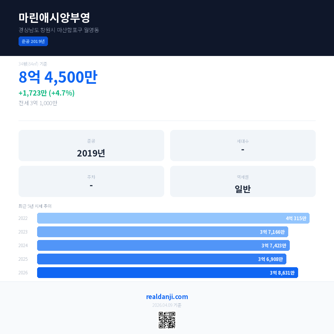 마린애시앙부영 국민평형 기준 2026년 평균 거래가는 3억 8,631만으로, 전년 대비 4.7% 상승 했습니다.
