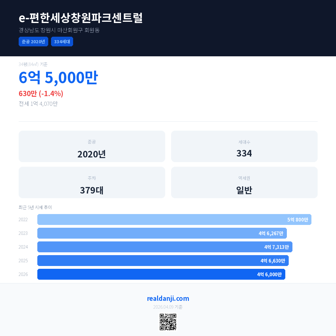 e-편한세상창원파크센트럴은(는) 2020년에 준공되었으며, 현재 6년차입니다. 총 334세대 규모입니다.