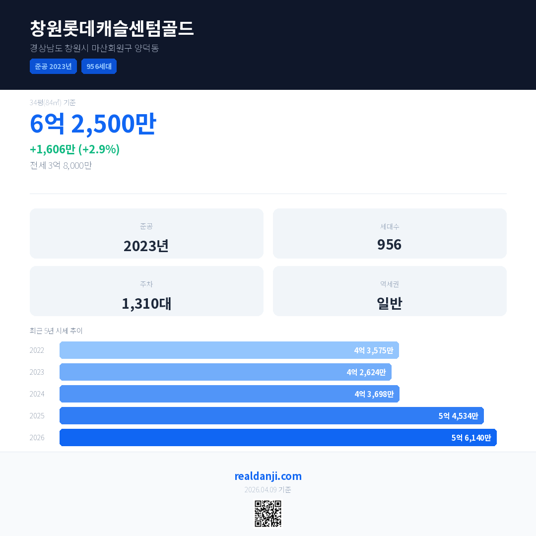 창원롯데캐슬센텀골드 국민평형 기준 2026년 평균 거래가는 5억 6,140만으로, 전년 대비 2.9% 상승 했습니다.