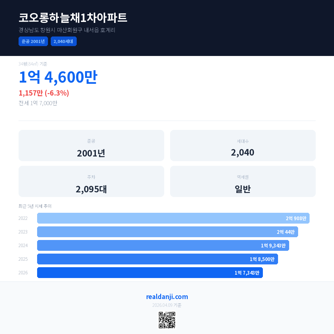 코오롱하늘채1차아파트 국민평형 기준 2026년 평균 거래가는 1억 7,343만으로, 전년 대비 6.3% 하락 했습니다.