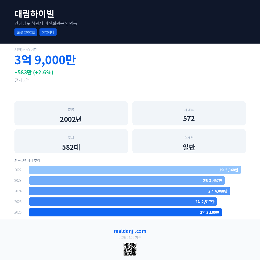 대림하이빌 국민평형 기준 2026년 평균 거래가는 2억 3,100만으로, 전년 대비 2.6% 상승 했습니다.