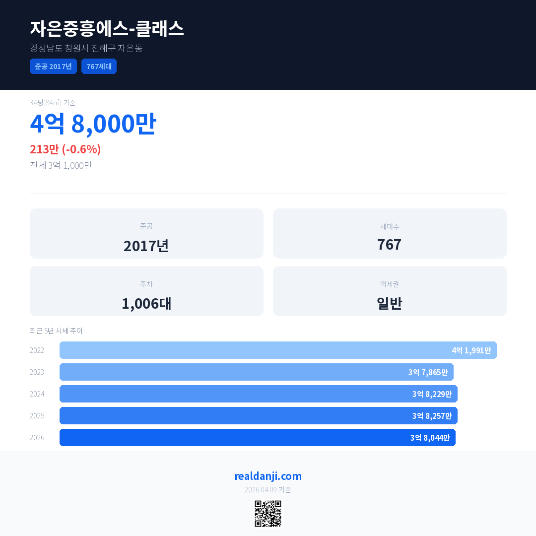 자은중흥에스-클래스 국민평형 기준 2026년 평균 거래가는 3억 8,044만으로, 전년 대비 0.6% 하락 했습니다.